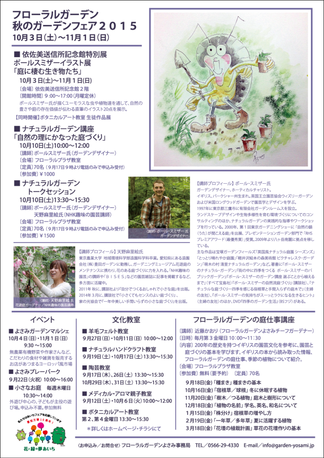 今年は緑化あいちフェアのサテライト会場になっていることもあり、スペシャルゲスト、ポールスミザーさんをお招きしました。天野麻里絵さんとのトークセッションも行います。