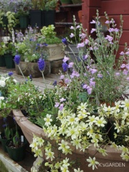ショップの店先が華やかになってきました。花壇では春咲きの一年草がちらほら咲き始めています。