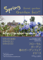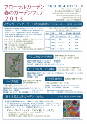 フローラルガーデン春のガーデンフェア 2013/04/27Sat ガーデン NEWS 5月3日、4日、5日の3日間フローラルガーデンよさみにてイベントを行います。いつものマルシェがグレードアップ。苗や植木の販売、各種教室も楽しめる3日間。ケイズガーデンカフェ前には英国アンティークマーケットが出現。イングリッシュガーデンの草花とともにイギリスの風景を堪能して下さい。