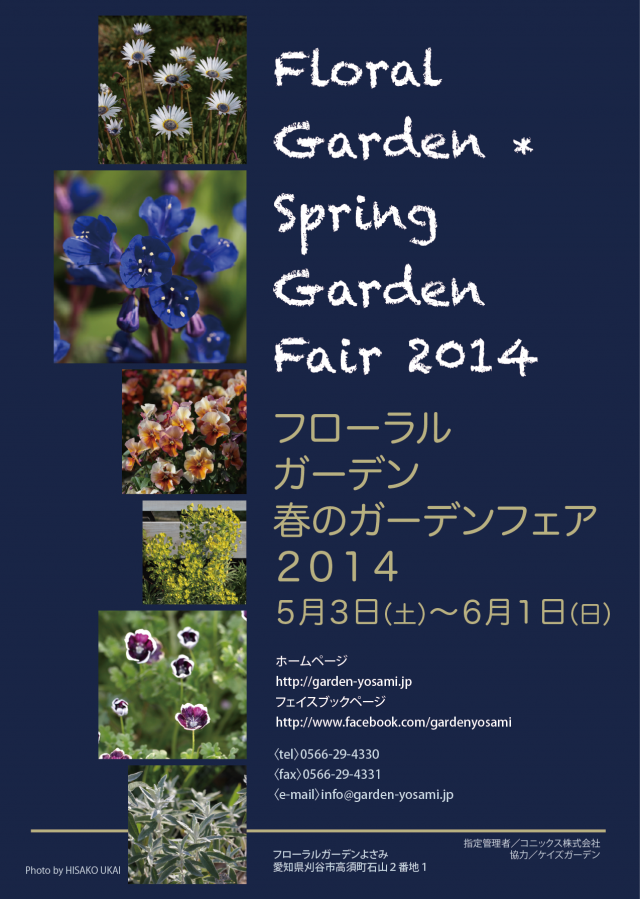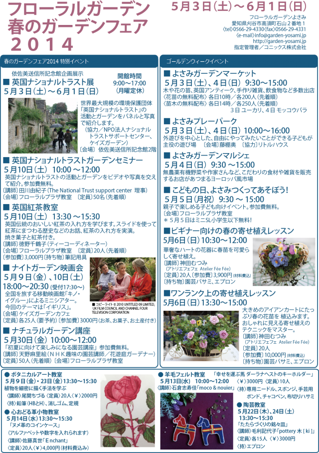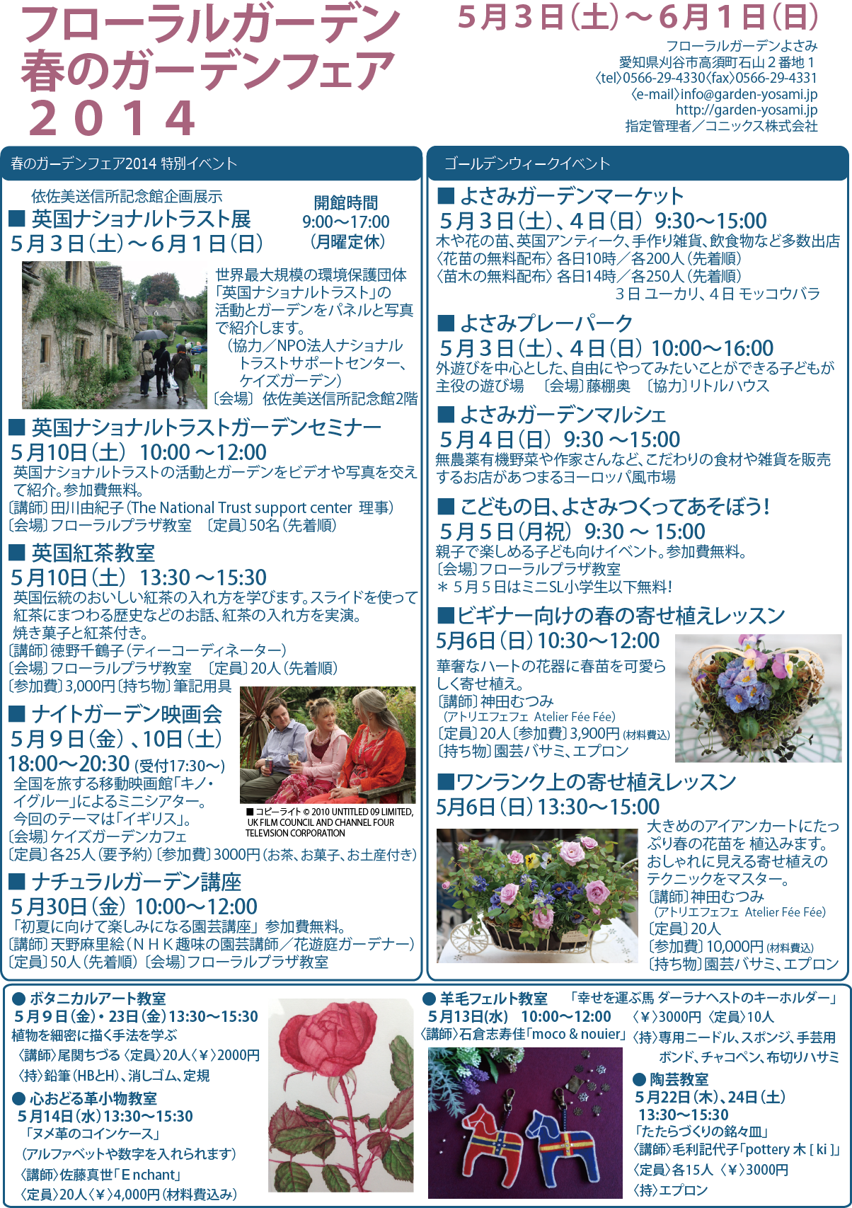 フローラルガーデン春のガーデンフェア2014 2014/04/13Sun ガーデン NEWS 様々な春の花が咲き誇るイングリッシュガーデン。今年は種から育てた春の花が倍増!風に揺れるガーデンをお楽しみ下さい。