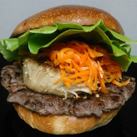 [オススメポイント] オリジナルハンバーガーにえのきステーキをトッピングしました。