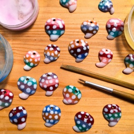 工房スタッフ・森哉が寄せ盛り(多色の色ガラス釉薬を盛り分けて焼成する七宝焼の技法)で制作する、ゆるーいきのこたちです。