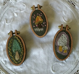 思いつくまま刺したので、幻のキノコです。刺繍枠 ( 5cm×3cm )がそのままブローチなっているところが可愛いと思います。