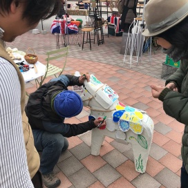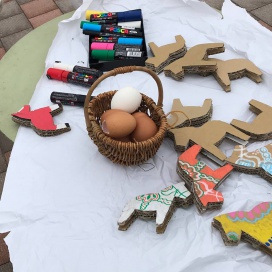 スウェディッシュトーチの傍では、来場者・出店者がダーラナホースやイースターエッグに色つけ。