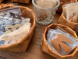 手作りの木製キーホルダーやポーチ、石粉マグネットやブローチ、