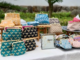 切り絵や和紙をアレンジした木製ブローチやヘアゴムなどのアクセサリー、型染のポーチや小物入れ、