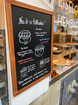 FIKAの国スウェーデンにはどの街にも必ずお菓子屋さんがあり、カフェ、パン屋さんとともにお茶を楽しむ場が充実しているなーと感じます。今回立ち寄ったオーデンプランのコンディトリはカフェは併設されてない、持ち帰りのみのお菓子屋さんスタイル。ウィンドウには様々な焼菓子と並んで冬の定番セムラが一番目立つところに飾ってあります。表の看板には可愛らしい親子のキャラクターでセムラが描かれていました。とても親しみやすい庶民派のコンディトリ。歩行器を使って歩いているお年寄りが入って行ったのに続き、中を覗いてみることに。